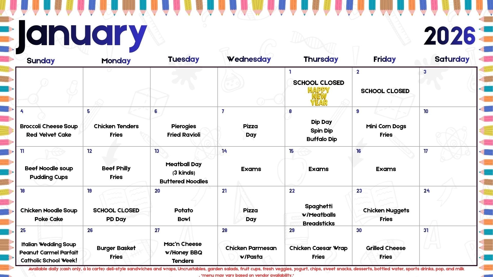 All lunch items are a la carte. Enjoy items such as pasta salad, sandwiches, cheeseburgers, salads and fruit cups daily. Smoothies, yogurt and fresh fruit are also available. Lunch entrees specials change daily and are listed on the lunch menu. Milk, water, a variety of juices and pop are available for purchase. A regular lunch costs around $5.00.