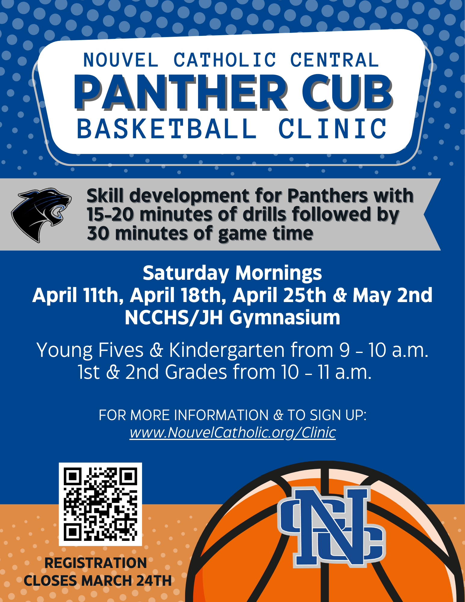 Students in Young Fives through 2nd grade are invited to join us for our instructional youth basketball league held on Saturday mornings. We aim to offer purposeful skill development for our young Panthers to promote enjoyment of playing the game and enable players to succeed at the higher levels of basketball.