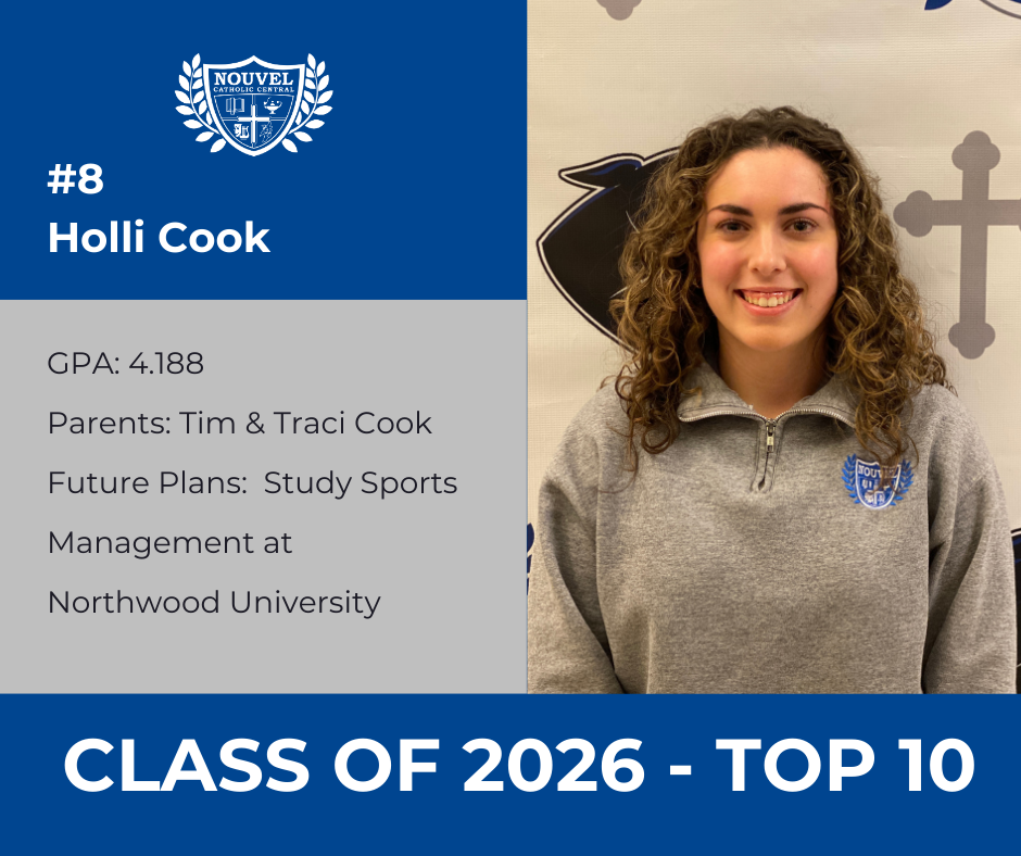 Our next Class of 2026 top 10 highlight is number 8 on the list, Holli Cook! Holli is the daughter of Tim and Traci Cook, and earned a 4.188 GPA. She is planning on attending Northwood University to study sports management. The family are members of St. Thomas Aquinas Parish. Congratulations, Holli!