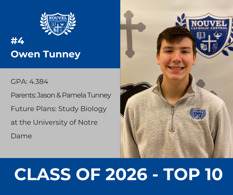 Our next Class of 2026 top 10 highlight to number 4 on the list, Owen Tunney! Owen is the son of Jason and Pamela Tunney, and earned a 4.384 GPA. He is planning on attending the University of Notre Dame to study biology. The family are members of St. Thomas Aquinas Parish. Congratulations, Owen!