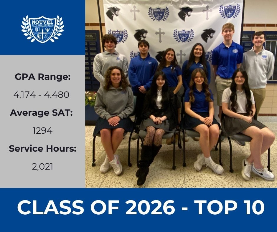 We are excited to announce our Top 10 students for the Class of 2026! We are proud of each of these students and their amazing academic success. The GPA's in the class range from 4.174 to 4.480 and the average SAT score among the group was 1294. On top of their academic achievements, the group in total has given back over 2,000 hours in service during their time in high school.